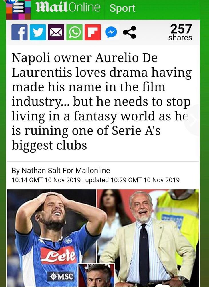 “Il proprietario del Napoli Aurelio De Laurentiis ama il dramma, essendosi costruito il suo nome nell’industria cinematografica… ma deve smetterla di vivere in un mondo di fantasia, visto che sta rovinando uno dei club più importanti della Serie A”.