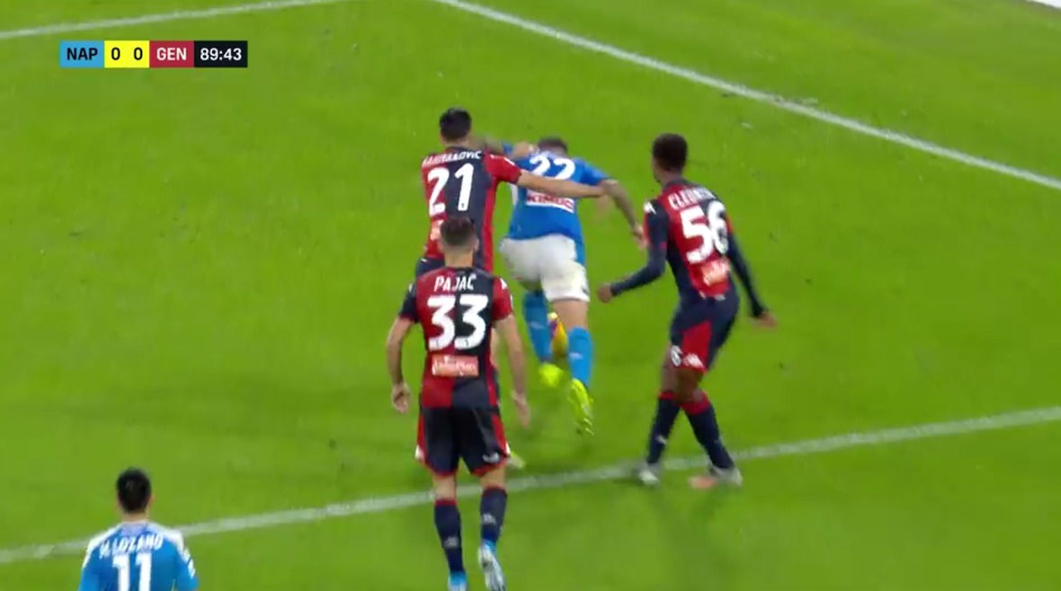 “Ma no Di Lorenzo, passa in mezzo a due in area per andare verso la porta, e si butta a terra appena sente una mano sulla spalla, ma che fai”.