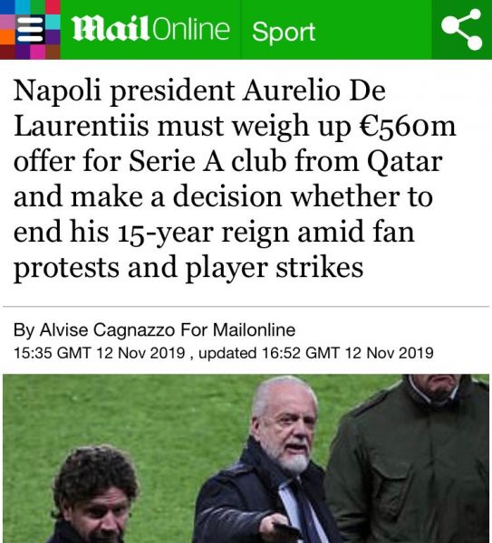 A quanto ammonta l’offerta? Secondo quanto si legge sulle pagine online del Mail, si tratterebbe di una cifra vicina ai 560 milioni di euro. A mettere una cifra così elevata sul piatto sarebbe stata la famiglia qatariota Al-Thani, un nome da tempo accostato al Napoli. Già in passato uscirono rumours su di loro.