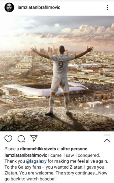 “Sono venuto, ho visto, ho conquistato. Grazie Los Angeles Galaxy per avermi fatto sentire di nuovo vivo. Ai suoi fan dico: volevi Zlatan, ti ho dato Zlatan. Prego. La storia continua … Ora tornate a guardare il baseball“.