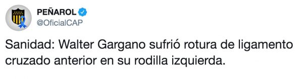 E purtroppo l’infortunio si è ripetuto. Il Peñarol ha comunicato tramite Twitter il nuovo problema per Gargano: rottura del legamento crociato anteriore della gamba sinistra. La notizia ha gettato nello sconforto il centrocampista classe ’84, che potrebbe così decidere di concludere anticipatamente la sua carriera. Di seguito il tweet della squadra uruguaiana: