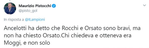 “Ancelotti ha detto che Rocchi e Orsato sono bravi, ma non ha chiesto Orsato. Chi chiedeva e otteneva era Moggi, e non solo” questo il tweet del giornalista che usato parole forti in merito alla designazione arbitrale.