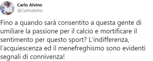 “Fino a quando sarà consentito a questa gente di umiliare la passione per il calcio e mortificare il sentimento per questo sport? L’indifferenza, l’acquiescenza ed il menefreghismo sono evidenti segnali di connivenza!”