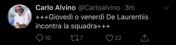NEWS NAPOLI CALCIO – Il noto giornalista partenopeo Carlo Alvino ha lanciato una clamorosa indiscrezione attraverso il proprio profilo Twitter ufficiale: “Giovedì o venerdì De Laurentiis incontra la squadra“.