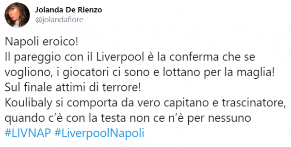 Queste le parole della giornalista partenopea: “Napoli eroico! Il pareggio con il Liverpool è la conferma che se vogliono, i giocatori ci sono e lottano per la maglia! Sul finale attimi di terrore! Koulibaly si comporta da vero capitano e trascinatore, quando c’è con la testa non ce n’è per nessuno”.