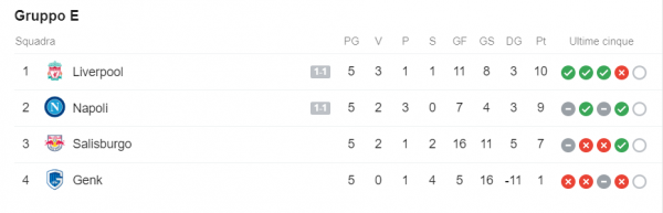Con questo pareggio il Napoli mantiene la sua imbattibilità in Champions e resta fermo in seconda posizione dopo il Liverpool, da cui lo separa solo un punto. La gara successiva contro il Genk sarà fondamentale per passare il turno.