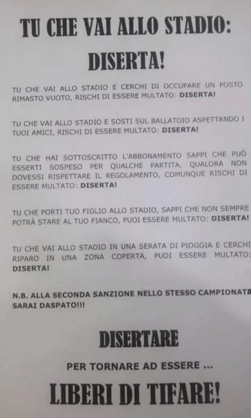 “Tu che vai allo stadio e cerchi di occupare un posto rimasto vuoto, rischi di essere multato: DISERTA!“.