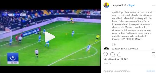 “Muovetevi ca**o come si sono mossi quelli che da Napoli sono andati ad Udine (850 km) o quelli che fanno l’abbonamento a Sky e Dazn (che costa tanto) solo per vedere voi che correte. Voi non dovete solo vincere… voi dovete correre e sudare. A voi ,a fine partita non deve restare asciutta nemmeno la mutanda. E invece voi vi siete fermati“.