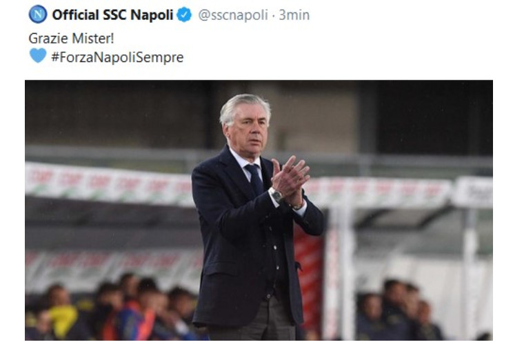 NEWS NAPOLI CALCIO – Anche la società azzurra, non può esimersi dal saluto a Carlo Ancelotti, personaggio che, a prescindere dagli ultimi due mesi, a Napoli ha regalato più di un sorriso.