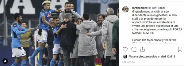Anche Carlo Ancelotti in persona ringrazia e saluta il Napoli. Ecco il messaggio postato su instagram dall’ex tecnico partenopeo: