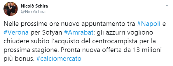 Secondo quanto riportato da Nicolò Schira della Gazzetta dello Sport, nelle prossime ore è fissato l’appuntamento tra Napoli e Verona per Sofyan Amrabat. La nuova offerta è di 13 milioni più bonus per il centrocampista classe ’96.