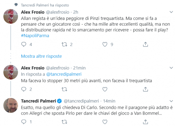 La risposta del collega di BeIn Sports, Tancredi Palmeri, è la seguente: “Secondo me il paragone più adatto è con Allegri che sposta Pirlo per dare le chiavi del gioco a Van Bommel”