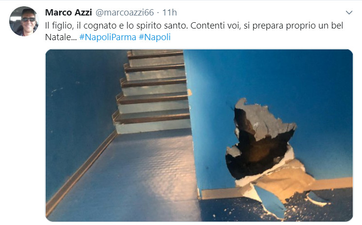 Il giornalista di Repubblica Marco Azzi, ha postato sul proprio profilo Twitter una foto scattata del tunnel che porta alla tribuna autorità dello stadio San Paolo, in cui è visibile una parete di cartongesso ridotta in frantumi.