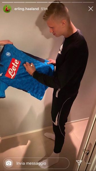 Una storia Instagram molto curiosa è stata pubblicata da Erling Haaland sul suo profilo ufficiale. L’attaccante del Salisburgo ha firmato diverse maglie da calcio, tra queste c’era anche quella del Napoli.