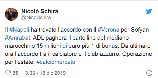 ” Il Napoli ha trovato l’accordo con il Verona per Sofyan Amrabat: ADL pagherà il cartellino del mediano marocchino 15 milioni di euro più 1 di bonus. Da ultimare ora l’accordo tra il calciatore e il club azzurro. Operazione per l’estate”