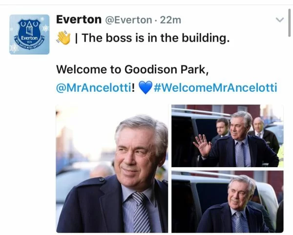 Carlo Ancelotti è ormai il nuovo allenatore dell’Everton, l’ex tecnico del Napoli è arrivato a Goodison Park e i Toffees gli hanno riservato un’accoglienza sui profili social.