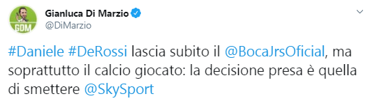 ORE 16.30 – Il giornalista di Sky e esperto di mercato Gianluca Di Marzio annuncia l’addio di Daniele De Rossi al Boca Juniors tramite un post su Twitter.