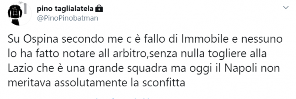 “Su Ospina secondo me c’è fallo di Immobile e nessuno lo ha fatto notare all’arbitro, senza nulla togliere alla Lazio che è una grande squadra ma oggi il Napoli non meritava assolutamente la sconfitta“.