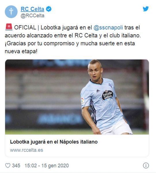 Lobotka è ufficialmente un nuovo giocatore del Napoli. Lo slovacco è stato da poco annunciato dal presidente De Laurentiis con il tweet di benvenuto. A salutarlo invece il Celta Vigo. “Grazie per il tuo impegno e buona fortuna in questa nuova tappa” scrive il club tramite il profilo Twitter ufficiale.