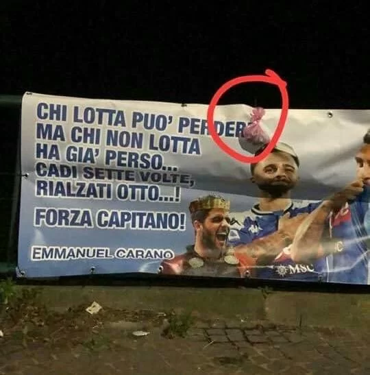 Qualche giorno fa è stato compiuto un bel gesto sotto casa del capitano azzurro Lorenzo Insigne: è stato apposto uno striscione d’incoraggiamento visti gli ultimi scarsi risultati ottenuti dall’interessato e dal Napoli. Tale striscione, firmato Emmanuel Carano, recita: “Chi lotta può perdere ma chi non lotta ha già perso… Cadi sette volte, rialzati otto! Forza capitano!“