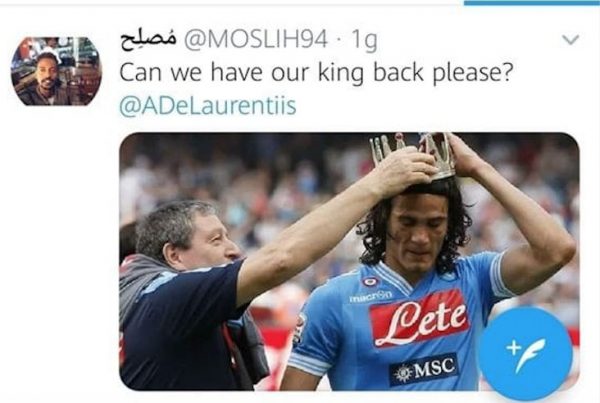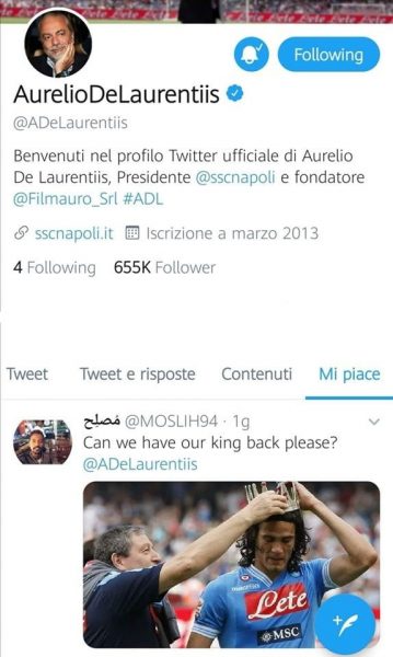 Il presidente del Napoli, su Twitter, ha infatti messo like al post di un tifoso (probabilmente arabo) che chiedeva la possibilità di rivedere il “Re Cavani“, con tanto di foto con corona, di nuovo in azzurro.