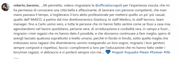 “Volevo ringraziare la SSC Napoli per l’esperienza vissuta, che mi ha permesso di conoscere una città bella e affascinante.