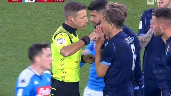 “L’arbitro Massa conferma che la categoria arbitrale è ai minimi termini e che è inutile lamentarsi che poi arbitrino sempre gli stessi. La prestazione è pessima sotto tutti i punti di vista. Può un arbitro internazionale farsi suggerire dal quarto uomo se deve dare un giallo o no? L’arbitro di Imperia offre una prestazione pesantemente insufficiente. Oltre alle indecisioni sul rigore per la Lazio e il rosso ad Hysaj, l’apice viene raggiunto dal rosso a Lucas Leiva. Il cartellino è corretto solo nella sua essenza, ma le decisioni sono tutte sbagliate. Il fallo che costa l’ammonizione al biancoceleste è inesistente. Il brasiliano avrebbe tutte le ragioni per protestare, ma, nella settimana del rosso a Balotelli per lo stesso motivo, mandare l’arbitro platealmente a quel paese, non è la scelta più saggia. Ulteriore errore il mancato giallo per Radu. Il difensore della Lazio entra duro sulla caviglia di Callejon, ma l’arbitro non fischia neppure il fallo”.