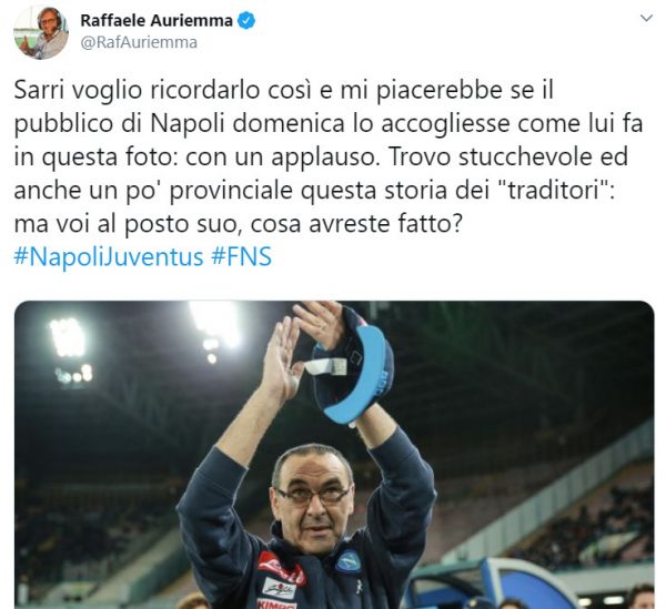 NOTIZIE CALCIO NAPOLI – Raffaele Auriemma, tramite il proprio profilo Twitter ha commentato l’imminente ritorno di Maurizio Sarri al San Paolo. Ecco quanto evidenziato dalla nostra redazione: