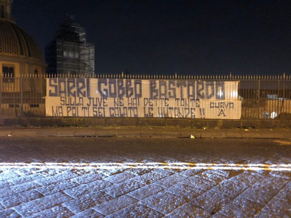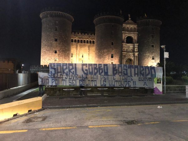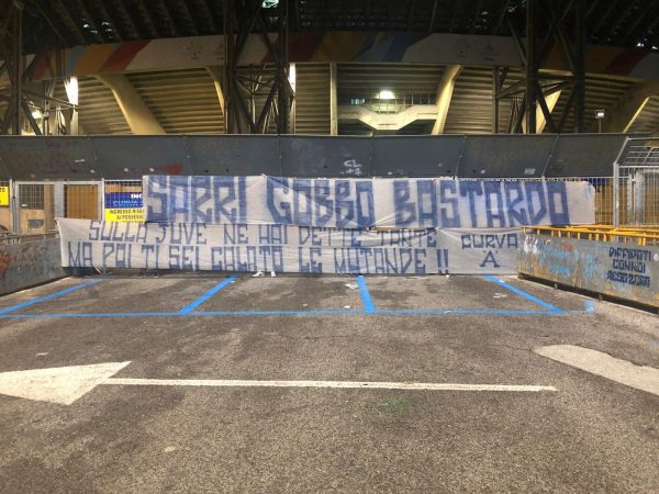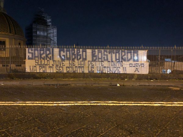 Stanotte, all’esterno del San Paolo e in alcuni punti strategici della città, sono stati esposti degli striscioni dedicati a Maurizio Sarri ad opera della Curva A. Questo il testo: “Sarri gobbo bastardo. Sulla Juve ne hai dette tante, ma poi ti sei calato le mutande. Curva A”.