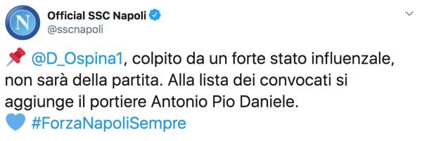 Al suo posto, come comunicato dalla SSC Napoli attraverso Twitter, è stato convocato il portiere della Primavera, Antonio Pio Daniele.