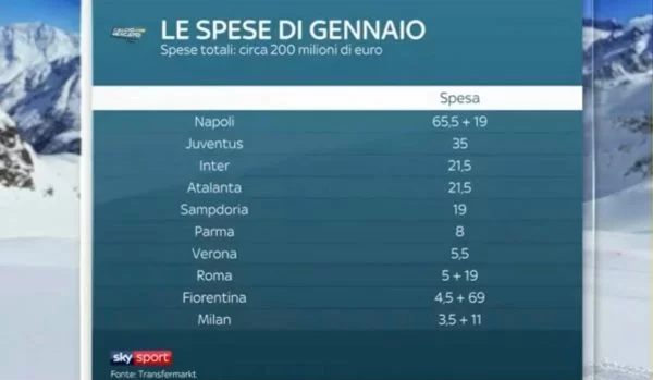 NEWS NAPOLI CALCIO – Il Napoli di De Laurentiis e Giuntoli si è mosso molto in questo mercato invernale. È stato un mercato atipico per i partenopei, che non erano abituati a spendere particolarmente nei mercati di riparazione passati. Le cifre finali parlano di una spesa complessiva di 84,5 milioni di euro. Cifra da record per gli azzurri e record anche in Serie A. Secondo quanto riportato dal grafico di Sky, nessun club ha speso quanto il Napoli, con la Juventus che ha speso 35 milioni e l’Inter 21,5 milioni.