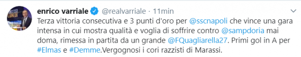 Il giornalista di Rai Sport, Enrico Varriale, ha commentato sul proprio profilo Twitter la vittoria del Napoli contro la Sampdoria. Questo il suo tweet: