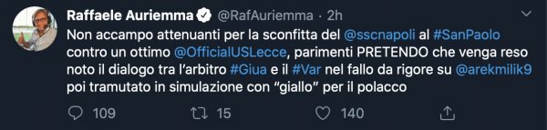 “Non accampo attenuanti per la sconfitta del Napoli al San Paolo contro un ottimo Lecce, parimenti PRETENDO che venga reso noto il dialogo tra l’arbitro Giua e il Var nel fallo da rigore su Milik poi tramutato in simulazione con ‘giallo’ per il polacco”.