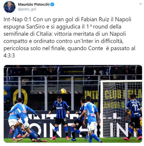 Il giornalista Maurizio Pistocchi ha commentato sul proprio profilo Twitter la vittoria del Napoli contro l’Inter, sottolineando ed esaltando la prestazione azzurra contro i calciatori di Antonio Conte. Questo il suo tweet: