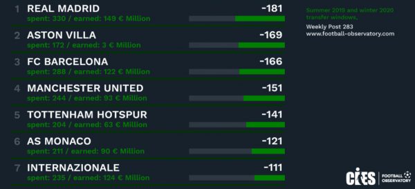 Il CIES Football Observatory ha svelato i conti delle squadre dopo le ultime due sessioni di mercato. Le squadre con il bilancio positivo: