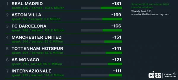 Il CIES Football Observatory ha svelato i conti delle squadre dopo le ultime due sessioni di mercato. Le squadre con il bilancio positivo: