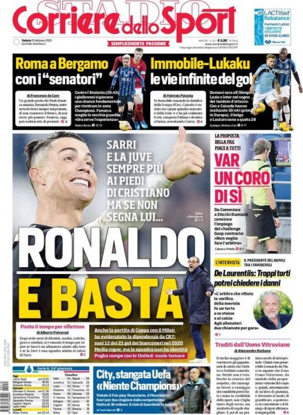 “L’arbitro che rifiuta la verifica della moviola fa un torto a se stesso e al calcio. Agli allenatori due chiamate a partita”, è la proposta di De Laurentiis per cambiare il VAR. Questa la prima pagina del Corriere: