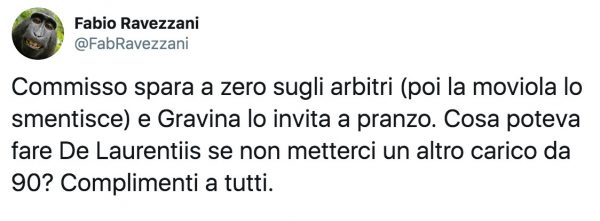 “Commisso spara a zero sugli arbitri (poi la moviola lo smentisce) e Gravina lo invita a pranzo. Cosa poteva fare De Laurentiis se non metterci un altro carico da 90? Complimenti a tutti”.