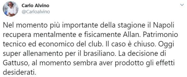 “Nel momento più importante della stagione il Napoli recupera mentalmente e fisicamente Allan. Patrimonio tecnico ed economico del club. Il caso è chiuso“.