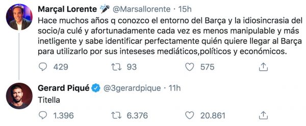 A rispondere al cronista è la bandiera del Barça, Gerard Piquè, con un commento secco ma devastante: “Titella” (“marionetta“, ndr). Chiaro come il Barcellona in questo momento sia una vera e propria polveriera. Il tutto alimentato dal dubbio su come mai il club non abbia fatto causa alla società l3 Ventures, nonostante il presidente Bartomeu si sia detto estraneo ai fatti.