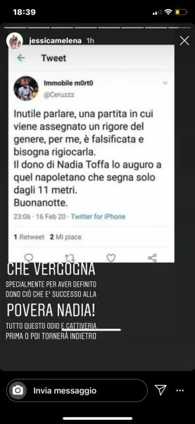 “Che vergogna, specialmente per aver definito dono quello che è accaduto alla povera Nadia! Tutto questo odio e cattiveria prima o poi tornerà indietro!”. Vergognoso anche il nome del profilo fake con cui è stato riversato odio social su Immobile: “Immobile morto”. La foto: