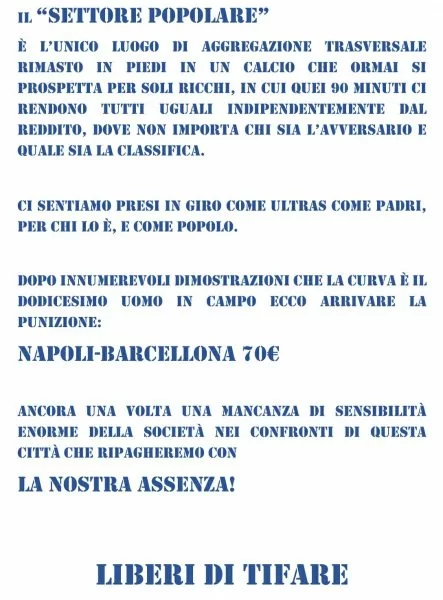 “Ci sentiamo presi in giro come ultras, come padri, per chi lo è, e come popolo. Dopo innumerevoli dimostrazioni che la curva è il dodicesimo uomo in campo, ecco la punizione: Napoli-Barcellona a 70 euro. Ancora una volta una mancanza di sensibilità enorme della società nei confronti di questa città che ripagheremo con la nostra assenza“.