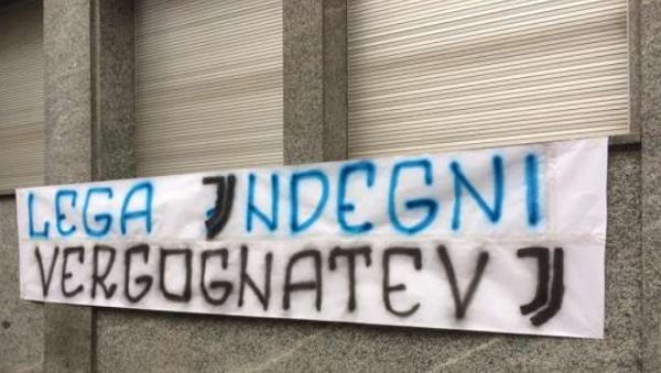 Nella giornata odierna alcuni rappresentanti del tifo organizzato dell’Inter si sono nuovamente recati sotto gli uffici della Lega Serie A di Via Rosellini accompagnati da nuovi striscioni dove si invita a rispettare i tifosi e il calcio italiano, incluso un ‘Vergognatevi’ rivolto alla stessa Lega, con la lettera i scritta con il logo della Juventus.