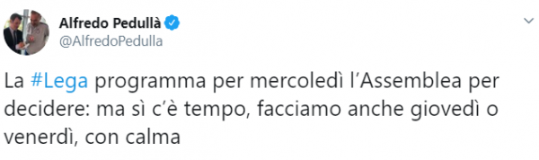 “La Lega programma per mercoledì l’Assemblea per decidere: ma sì c’è tempo, facciamo anche giovedì o venerdì, con calma”.
