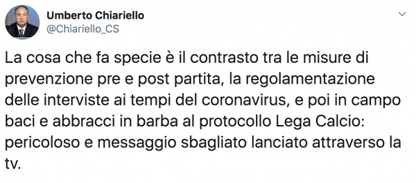“La cosa che fa specie è il contrasto tra le misure di prevenzione pre e post partita, la regolamentazione delle interviste ai tempi del coronavirus, e poi in campo baci e abbracci in barba al protocollo Lega Calcio: pericoloso e messaggio sbagliato lanciato attraverso la tv“.