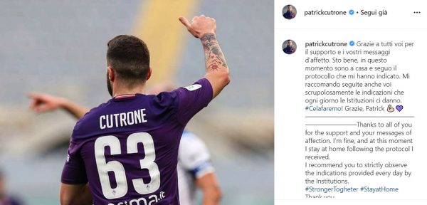 ULTIME NOTIZIE – L’attaccante della Fiorentina, Patrick Cutrone risultato positivo al Covid-19, ha voluto tranquillizzare tutti tramite un post sul proprio account Instagram: