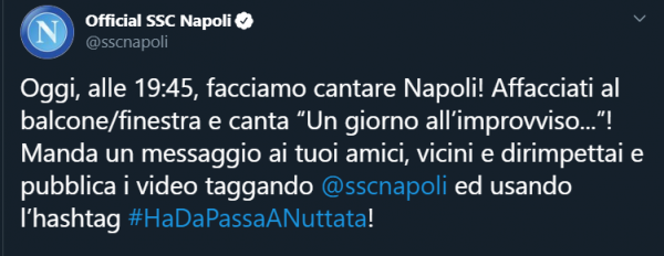 “Oggi, alle 19:45, facciamo cantare Napoli! Affacciati al balcone/finestra e canta “Un giorno all’improvviso…”! Manda un messaggio ai tuoi amici, vicini e dirimpettai e pubblica i video taggando la SSC Napoli ed usando l’hashtag #HaDaPassaANuttata!”