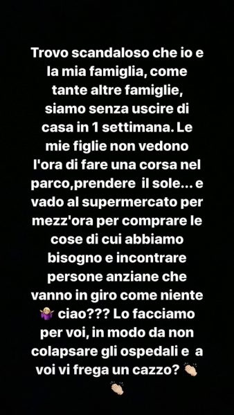 “Trovo scandaloso che io e la mia famiglia, come tante altre famiglie, siamo senza uscire di casa da una settimana. Le mie figlie non vedono l’ora di fare una corsa nel parco, prendere il sole. Vado al supermercato mezz’ora per comprare le cose di cui abbiamo bisogno e incontro persone anziane che vanno in giro come se fosse niente. Noi lo facciamo per voi, in modo da non riempire gli ospedali, e a voi non vi frega un ca**o?”.