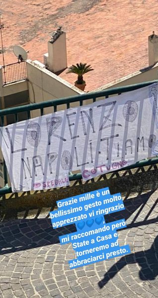 Sotto la sua casa, infatti, è stato esposto uno striscione che recita: “Lorenzo, Napoli ti ama!“. Lo stesso Insigne ha pubblicato la foto sui suoi social e ha risposto: “Grazie mille, è un bellissimo gesto molto apprezzato. Vi ringrazio. Mi raccomando però, state a casa e torneremo ad abbracciarci presto“.