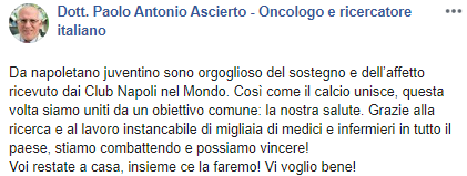 IL DOTTOR PAOLO ASCIERTO RINGRAZIA I CLUB NAPOLI NEL MONDO